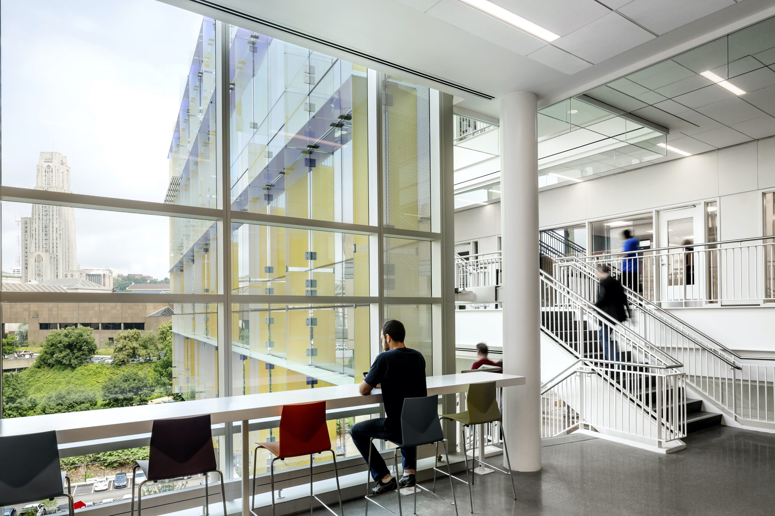 Faced with serious competition from three large firms for a difficult site squeezed between three buildings at Carnegie Mellon University, Office 52 came up with an unusual solution: challenging the university’s original master plan, they reduced the height of the suggested building from seven to four floors by placing a “clean room” underground next to it and extending the building into the ravine, supported by steel columns.