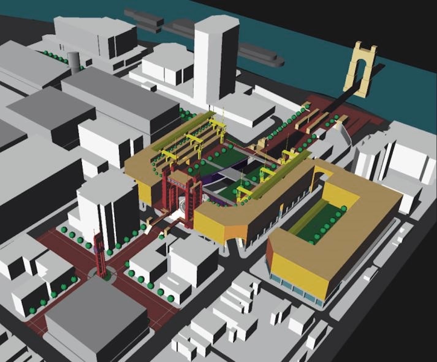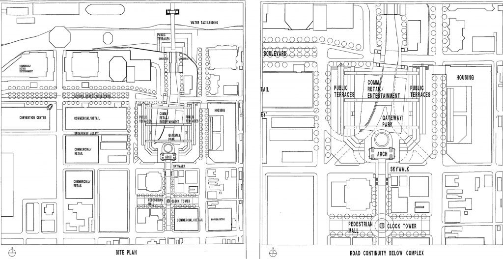 The result of a two-stage competition, the existing city administration that had supported the competition was defeated in an ensuing election by a candidate who had campaigned against the selected design. Without a contract, the plan by Arthur Golden was cancelled. In retrospect, had the competition only been a single stage process, Golden would already have been awarded the contract before the election, and we would have a different result today. One of the jurors noted that the second stage really wasn’t necessary, based on the favor the entire jury found with Arthur Golden’s winning entry at the conclusion of the initial stage.