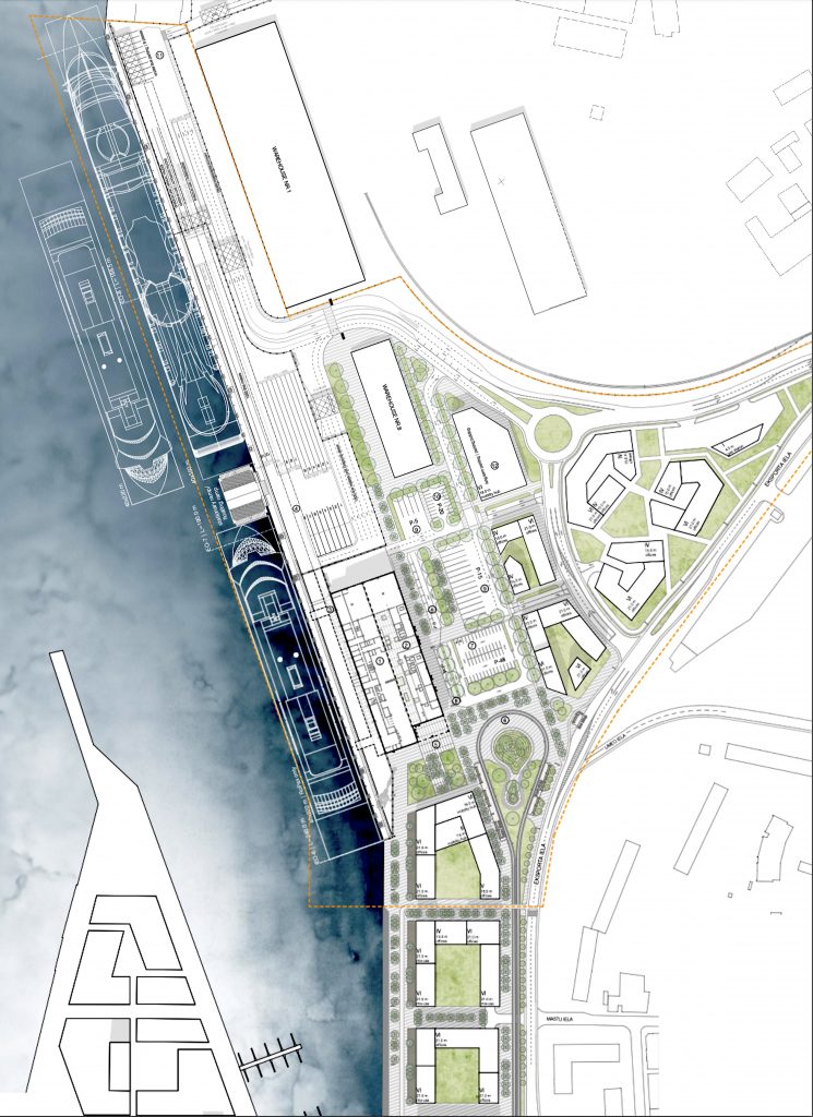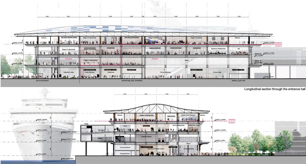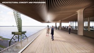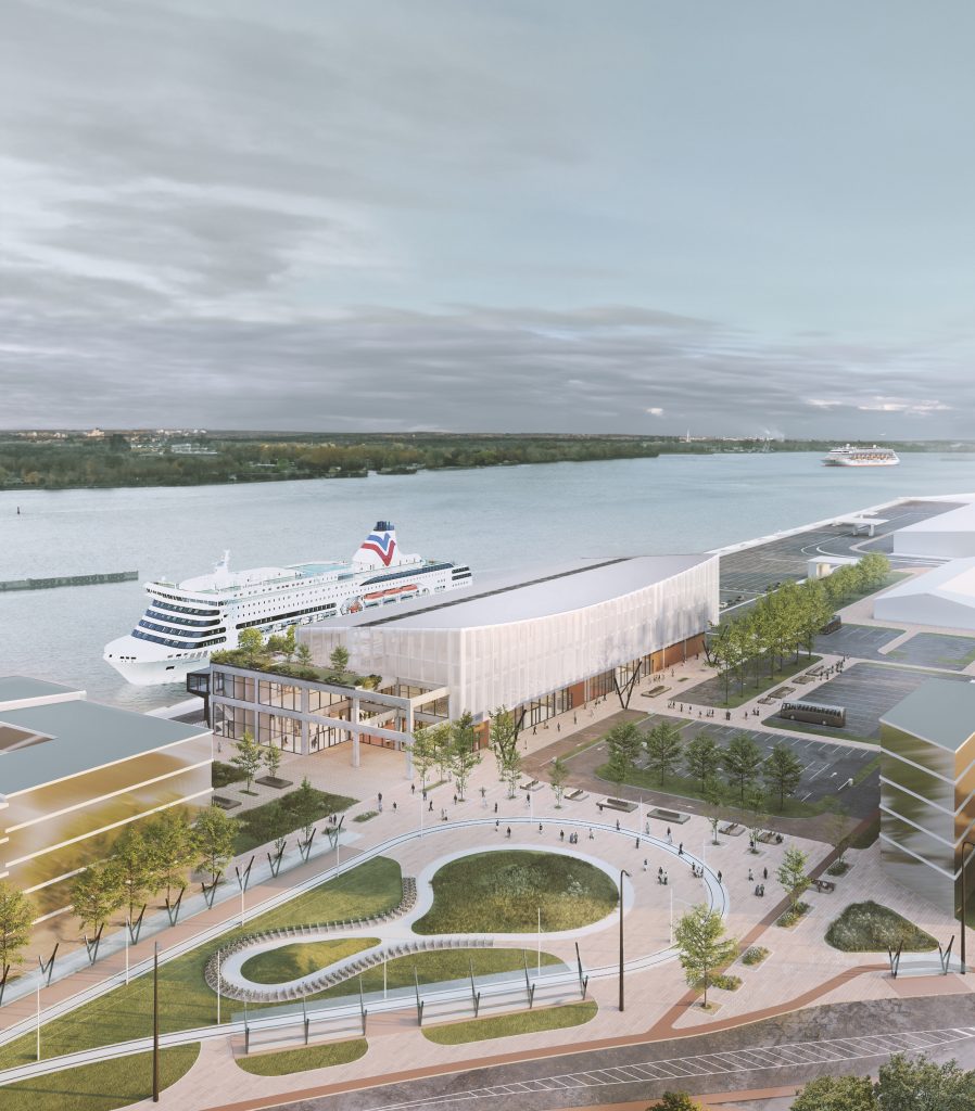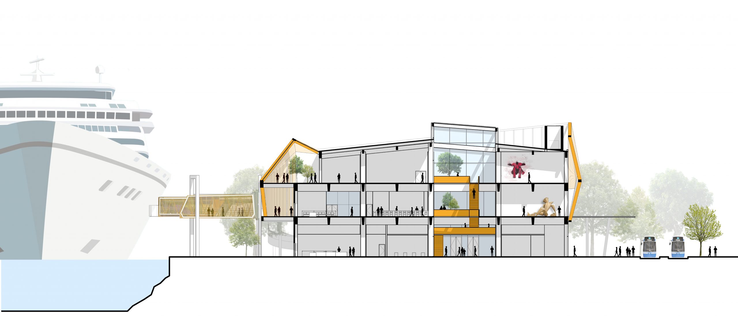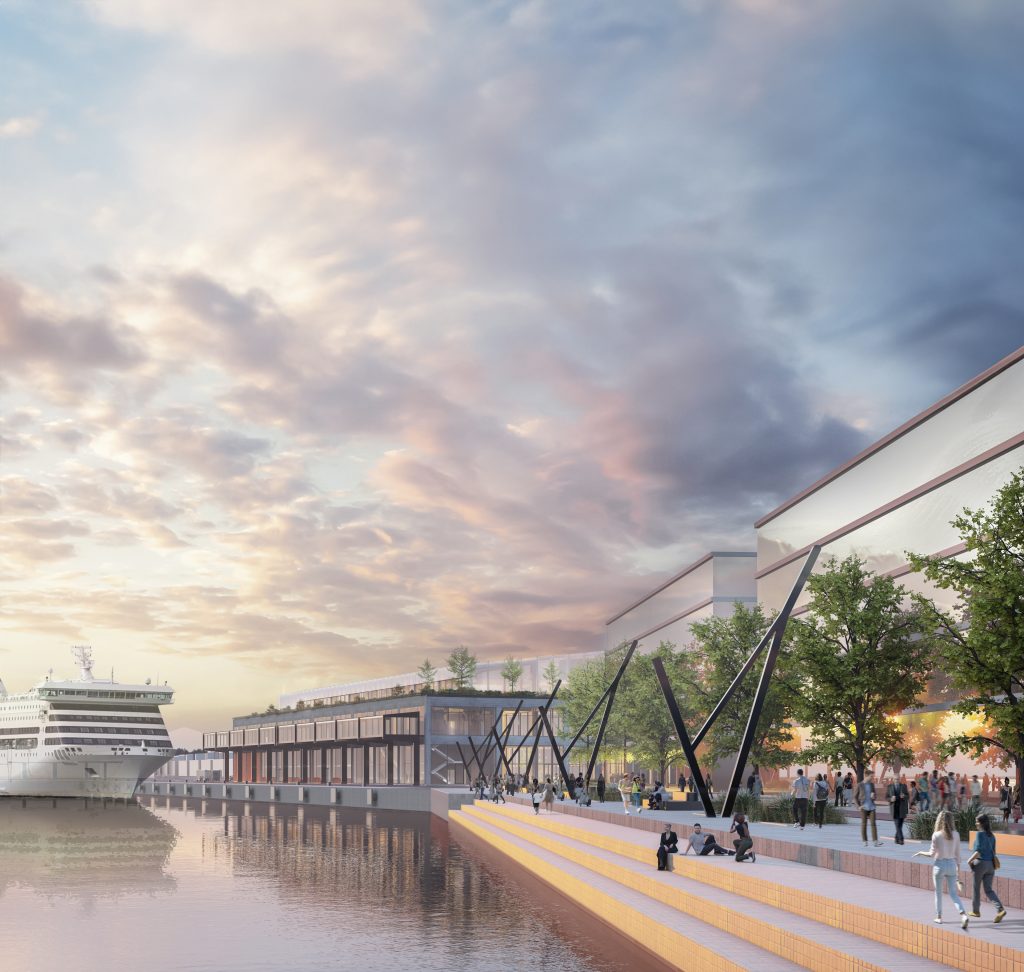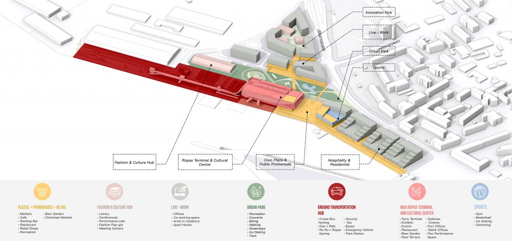 The first step toward establishing a more tourist friendly presence and simultaneously upgrading the area along that section of the city’s riverfront was to stage a design competition. International design competitions were nothing new for Riga, having staged a competition for the revitalization of the city’s Rail Terminal in 2016. The focus in this case is the repurposing of an existing shipping warehouse into a new 20,000 m2 ferry and cruise ship terminal. Because this is a reinforced concrete structure, it would place certain limitations on interior design, taking passengers on a linear journey to their destination. At the moment, the outside adjoining area has been used for container storage. That is all to change, for those participating in the competition were asked to design the entire area around the building and adjoining riverfront. Finally, the site would be converted to serve as a “multi-modal transport hub,” assuming this building would also serve a multiplicity of functions for the community—beyond its passenger processing requirements.