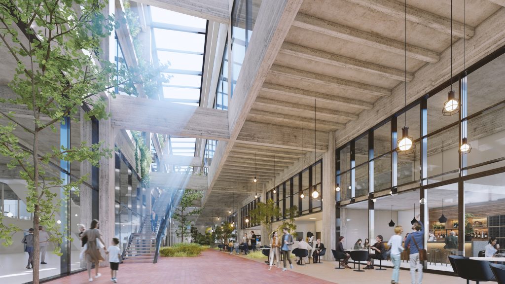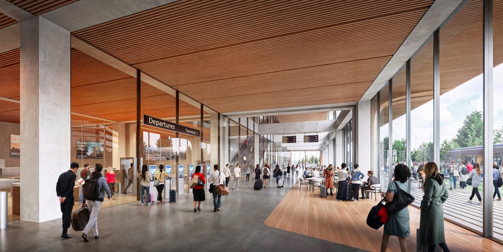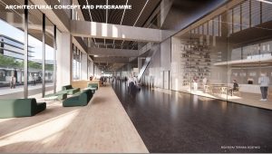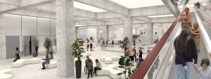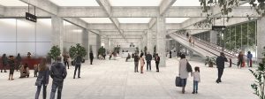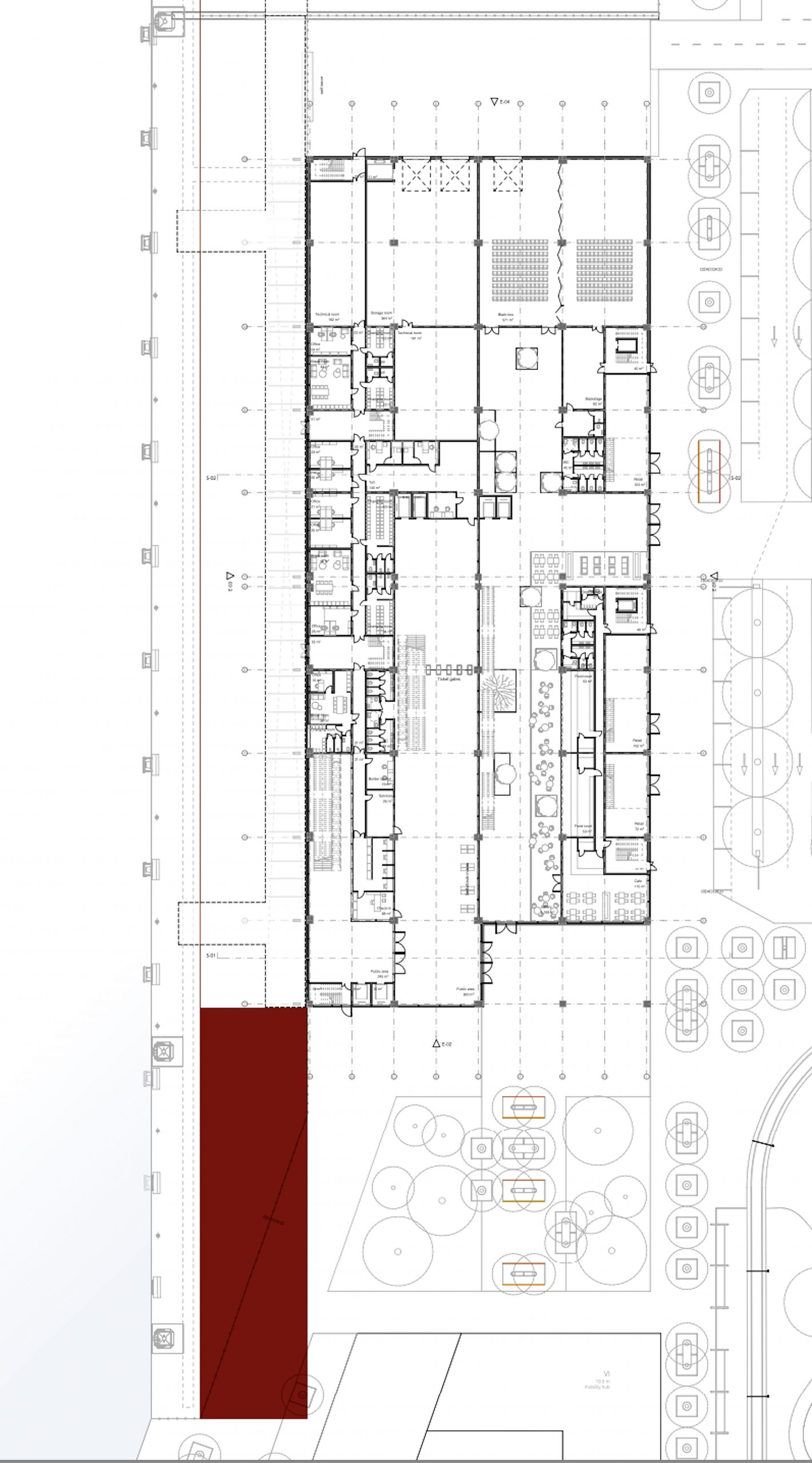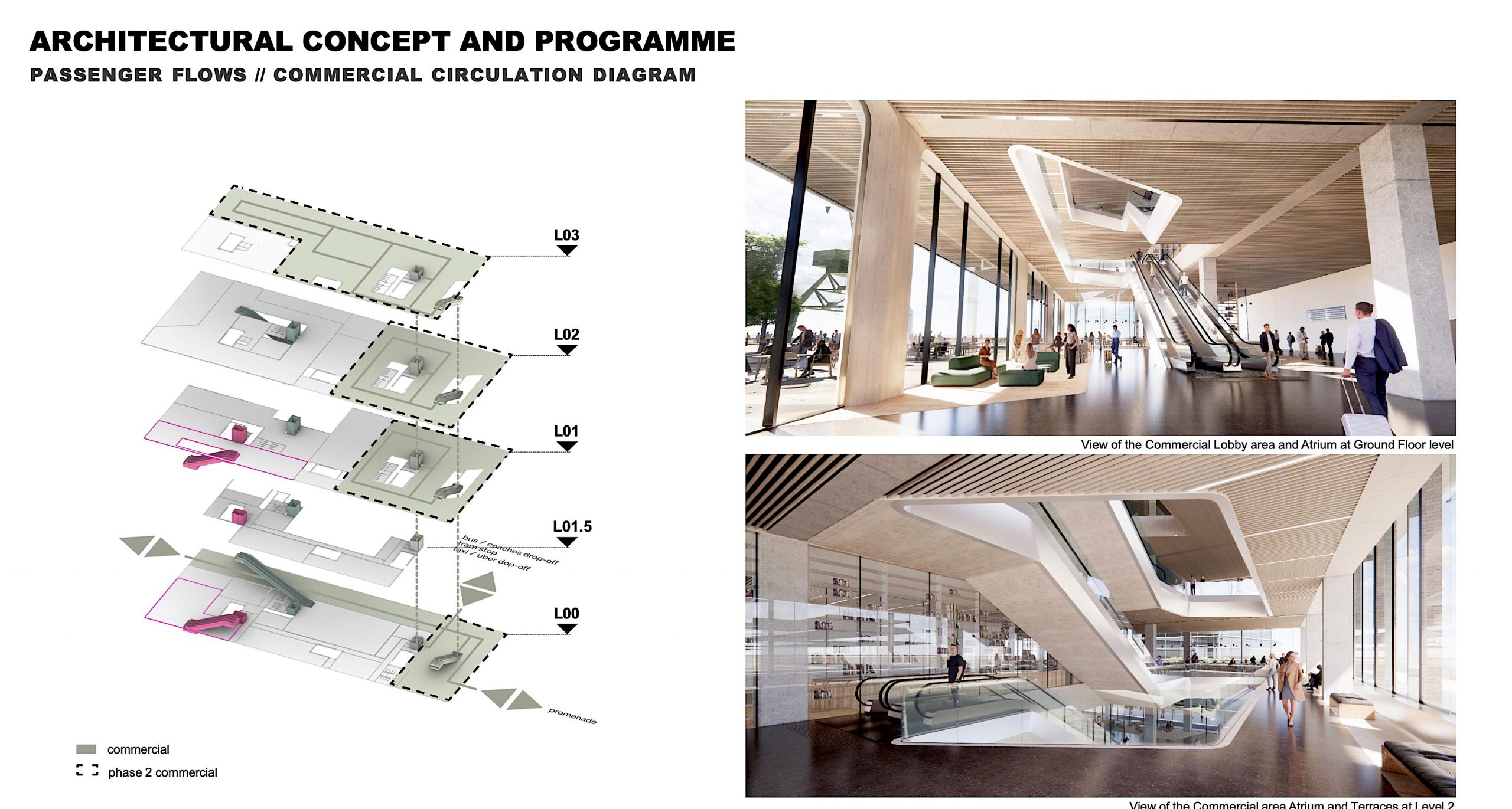 Building’s spine as atrium, separating the public urban space (right) from passenger area (left)