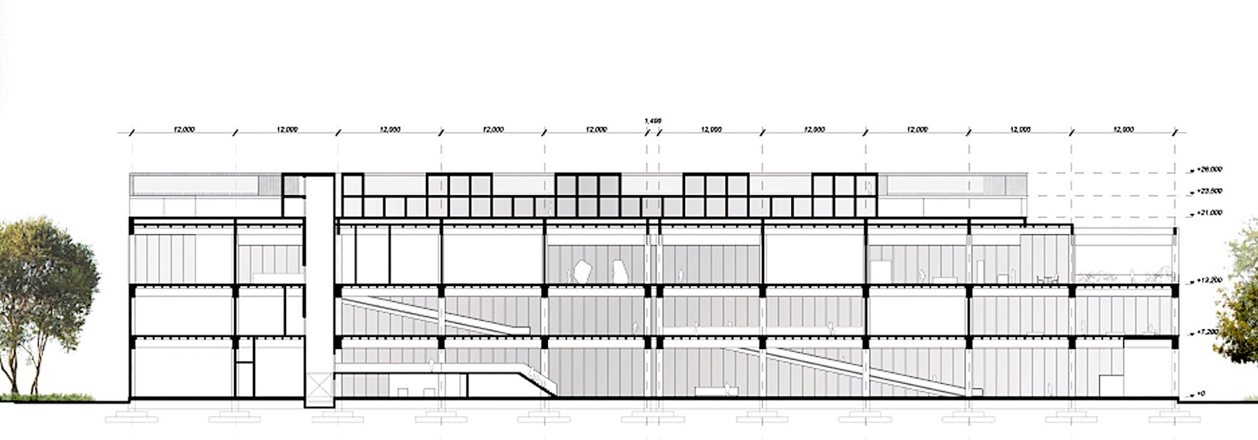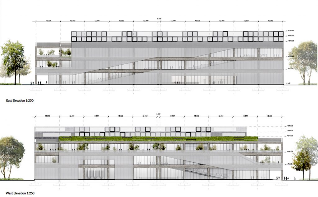 The treatment of the existing brutalist warehouse differed from entry to entry. Zaha Hadid’s entry opted for total enclosure, with the added top platform as a partially open area. R-Konsult and ALA both featured the use of the existing buildings support structure to suggest transparency, with the latter featuring it more promenently, while Barenblum Busch Architects opted for a strong facade treatment as design statement. -Ed