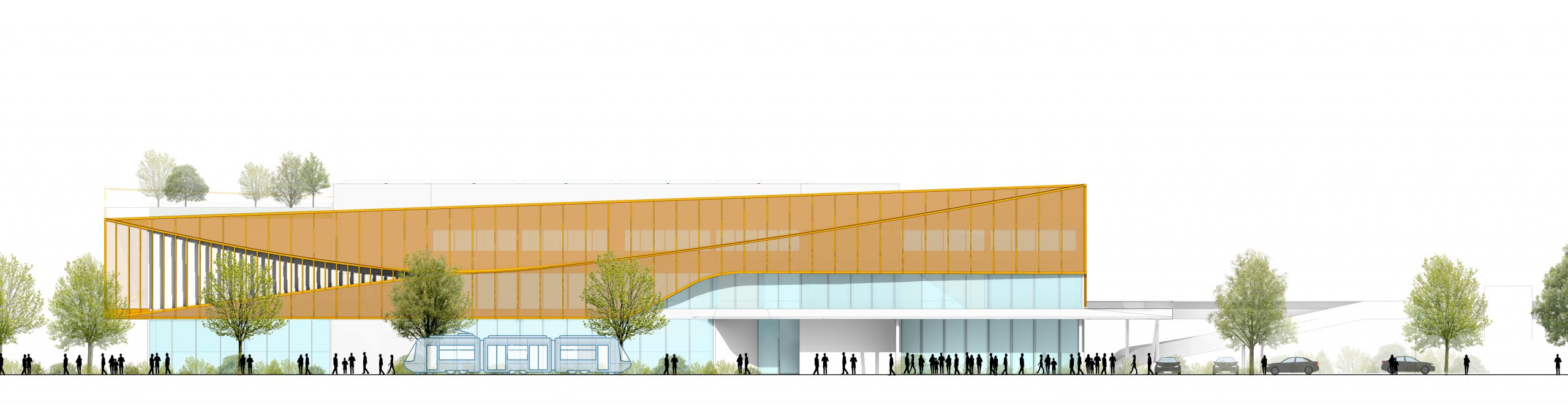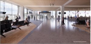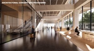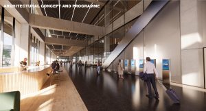 R-Konsult’s organizational concept had to catch the jury’s eye: separating the passenger from the public/urban areas by an atrium was a logical approach to the plan, not only in its completed form, but enabling the project to be built in phases—the passenger area first, then the public/urban phase afterwards. The top floor setback, providing a viewing terrace, was also well conceived in visual terms. The main entrance area from a plaza was not only a reference to the building’s original brutalist form, but could lend an aura of transparency to arrivals. -Ed