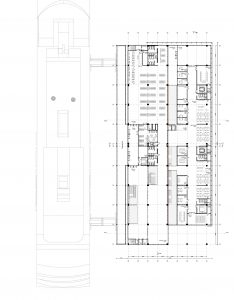 Berenblum Busch Architects’ organizational approach was to utilize the existing structure without adding additional floors—certainly justified based on the enormous size of the former warehouse. Instead of revealing elements of the original structure to the outside world, the impression was an impressive undulating structure, a skin consisting of wood and glazing, and a strong arrival experience reinforced by the creation of a park-like setting culminating in a large plaza. -Ed