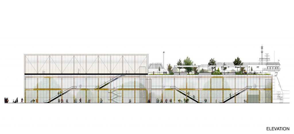 2. Certain elements such as passenger circulation to the eventual boarding area had to be addressed; but additional amenities could be suggested. As a result, two of the top five finalists added additional stories at the top of the structure as hotels, ALA Architects (Helsinki) and The Manser Practice (London); Zaha Hadid Architects added one additional platform on the top story, as did R-Konsult (Estonia). Berenblum Busch Architects (Miami) was the only firm to stick with the building’s original three stories.
