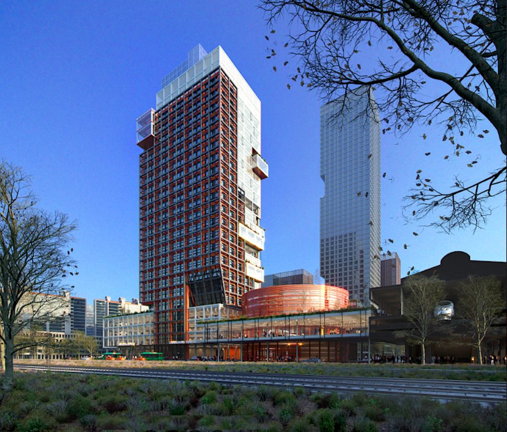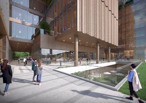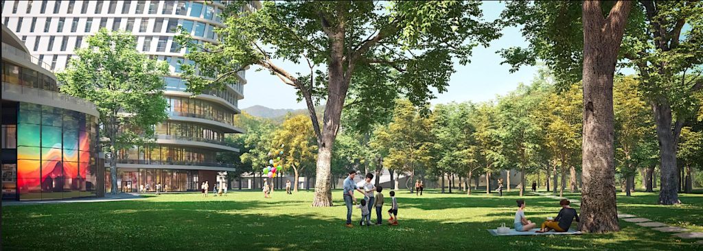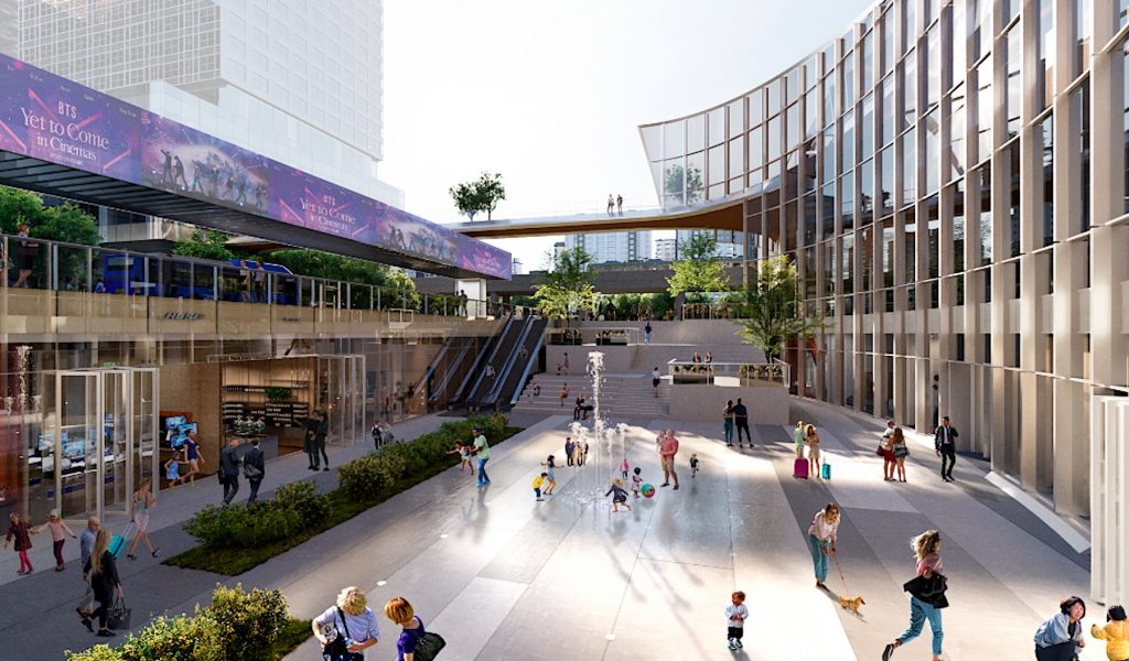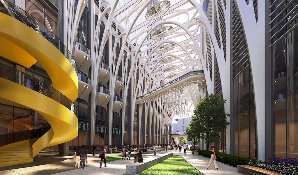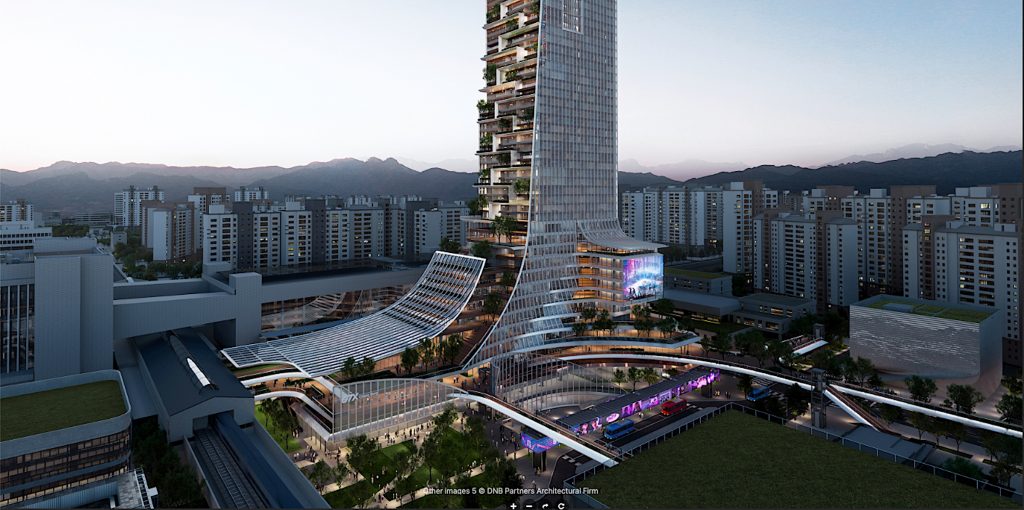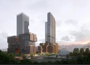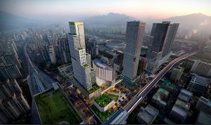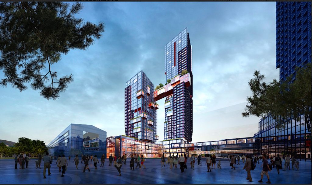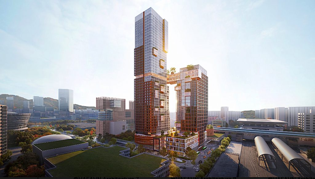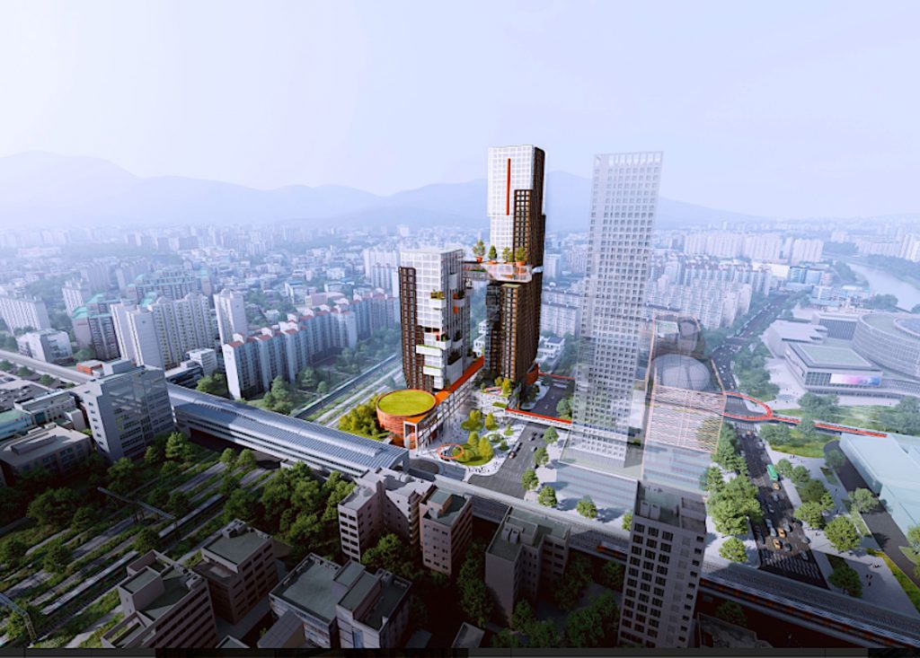 Observing the various finalist entries does show a number of intended (?) or unintended references to other projects. For instance, HAEAHN Architects second place design shows a prominent connector between their two buildings at a high level, similar to Cesar Pelli’s Petronas Towers in Malaysia. Eom & Lee’s third place winner was notable at grade level for its ramping, green reference to Elizabeth de Portzamparc’s Taichung high-rise in Taiwan, and DA Group’s fourth place winner’s atrium passage connector between their two buildings bears much similarity to several of Santiago Calatrava’s works, especially Toronto’s BCE Place Galleria. We might add that in all of those cases, these features did add much to their proposals. -Ed
