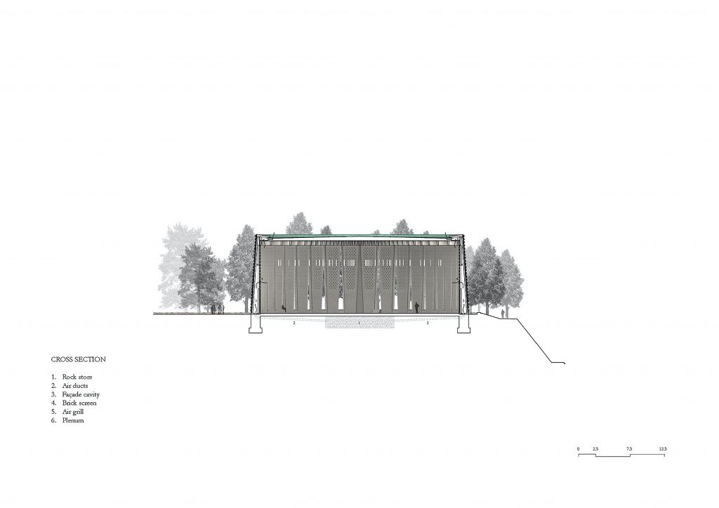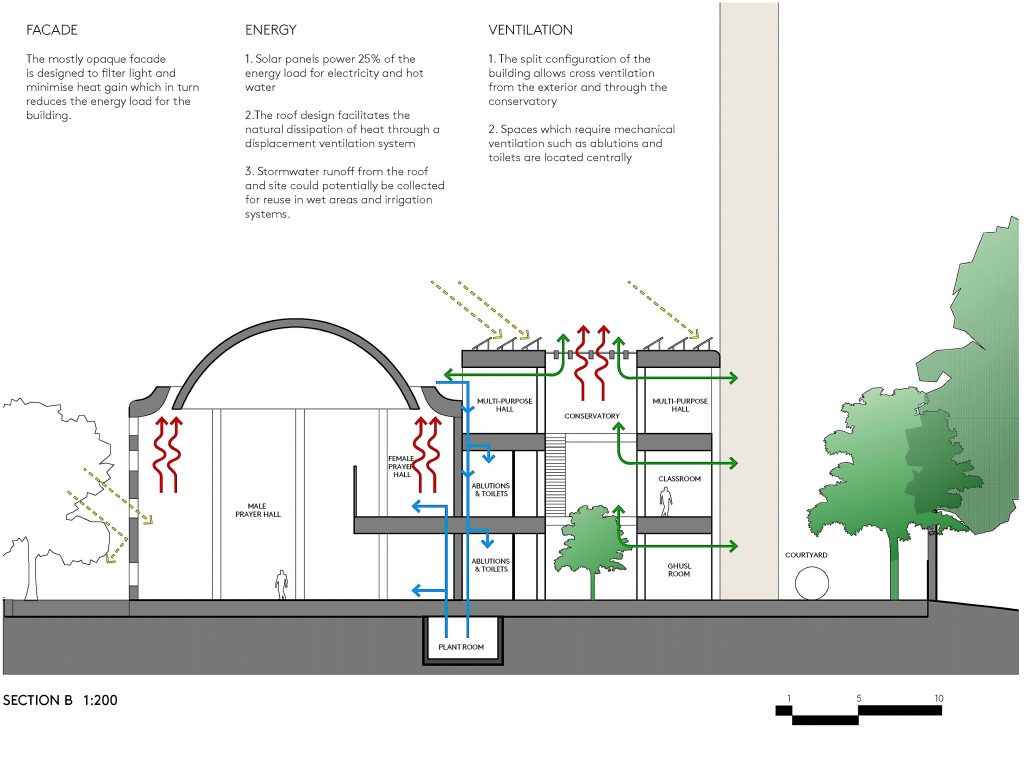 Functioning as an atrium, the three-level conservatory contributes to the mosque’s environmental sustainability. Beyond its role in social engagement, the conservatory aids in regulating internal temperatures. It harnesses solar heat gain in colder months and offers natural ventilation in warmer periods, minimizing the reliance on mechanical systems.