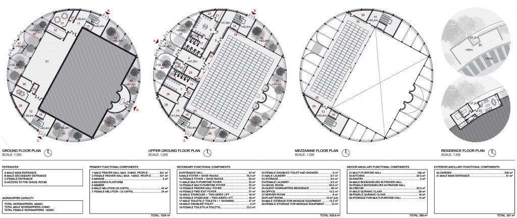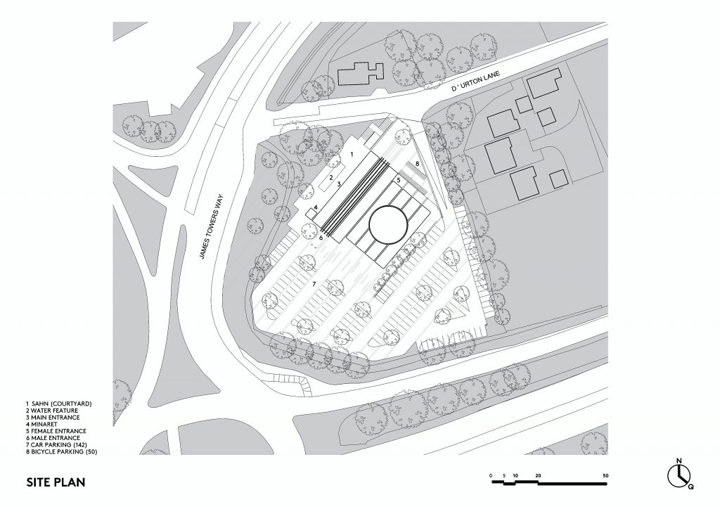 The guidelines foresaw a building with a maximum of four-stories, featuring a large main hall with capacity for 450 prayer mats plus circulation. As for sustainability, proposals were required to ‘seek to achieve a zero carbon development or as close to this as is reasonably possible’.