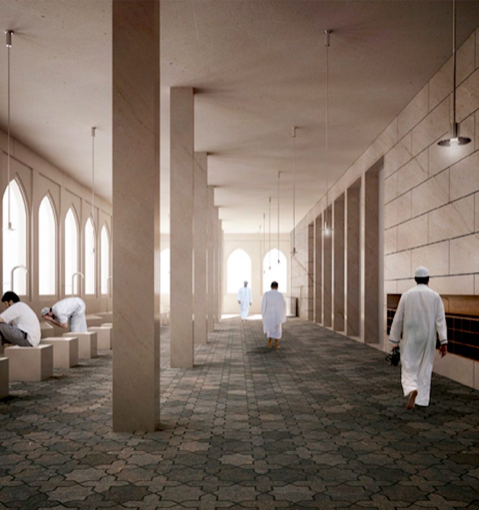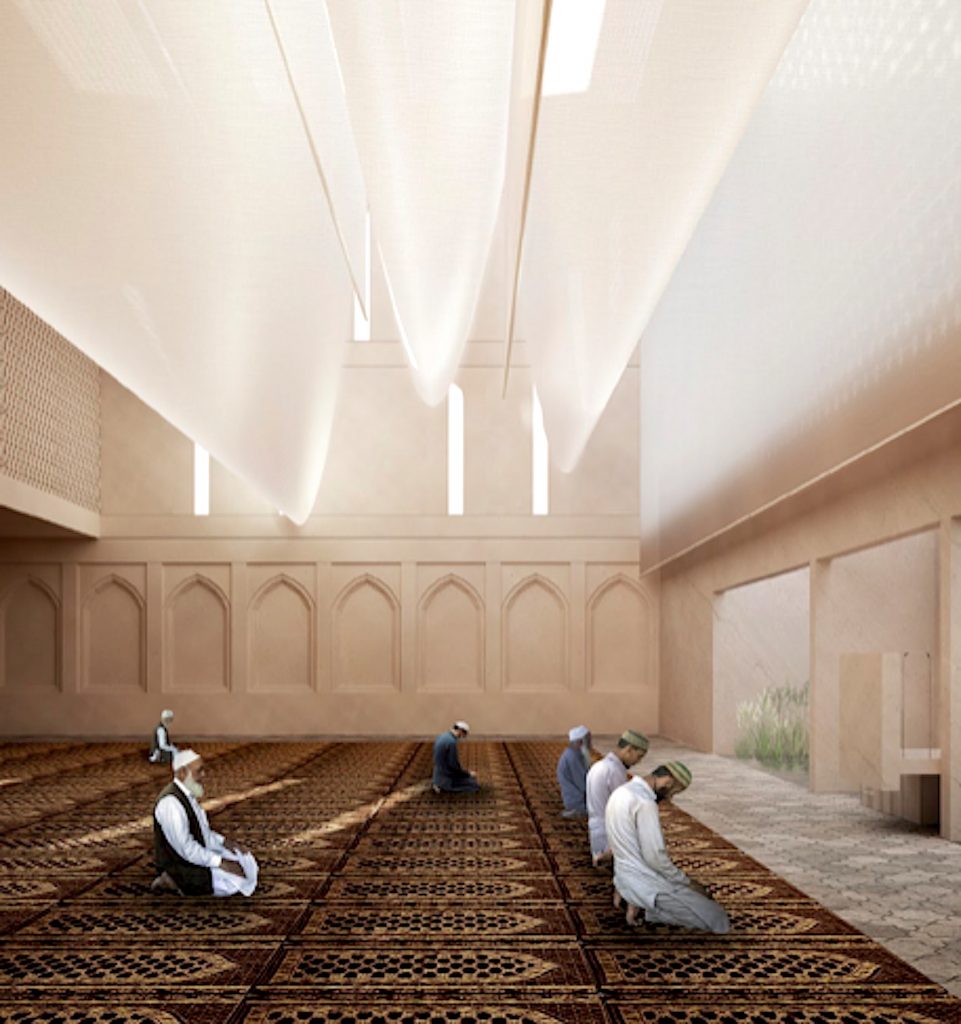 The exterior of the mosque unfolds as a seamless expression of the surrounding landscape, characterized by ribbons of locally sourced brick. This nod to Lancashire’s masonry heritage not only enhances the visual continuity but also regulates natural light within the interior spaces. The varying spacing of these ribbons carefully controls the porosity of the enclosure, creating intimate prayer spaces while opening up communal areas to an abundance of natural light. –Mcheileh Studio