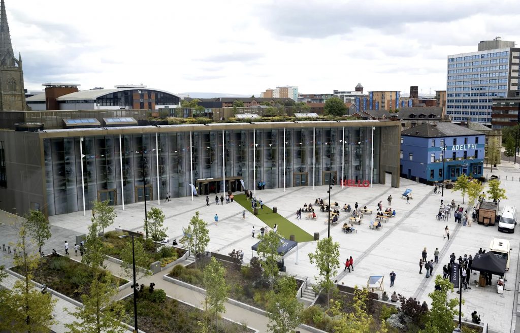 Good design seldom happens in a vacuum. And so it was with an international competition for a new mosque in Preston, U.K. A mid-sized city of 95,000, and located in Lancashire near the west coast and almost equally distant from London and Glasgow, Preston has a storied past, going all the way back to the Romans and the late Middle Ages, where it was the site of significant battles. During the Industrial Revolution, the city prospered, and it was not until after World War II that Preston experienced the British version of the U.S. Rust Belt. In the meantime, the city has experienced an upswing in economic activity, with an unemployment rate of only 3%. Aside from the appearance of new industries, the city has benefitted from the establishment of Central Lancashire University (CLU), which employs over 3,000 faculty and staff, and, as such, is one of the regions major employers. Any new university requires new facilities, and one of the most outstanding examples of this at CLU was the new Student Centre and Plaza, a result of a 2016 RIBA-sponsored competition won by Hawkins/Brown (below).