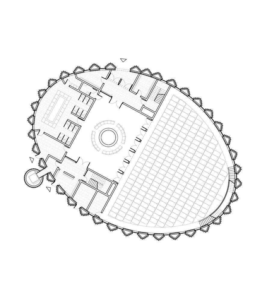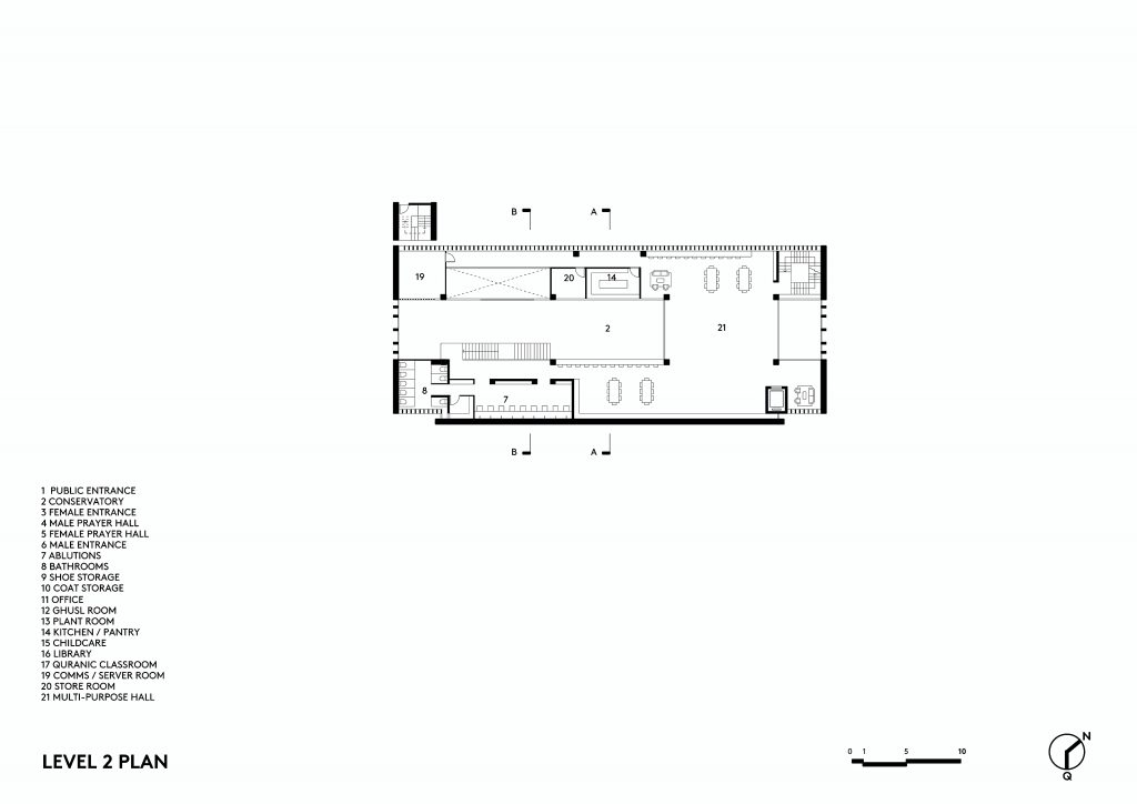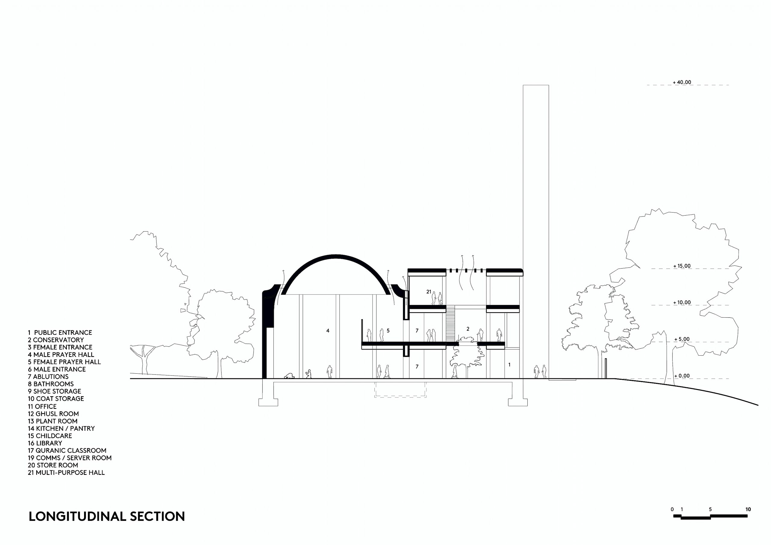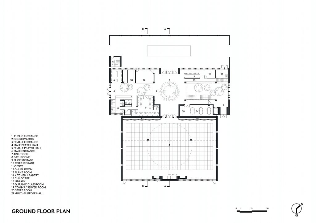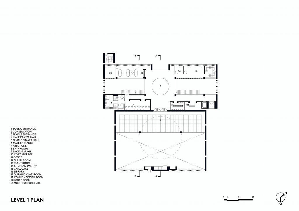 The proposal separated the everyday functions from the sacred space, expressed in two masses: A tall rectalinear mass over three storeys with prayer halls and learning spaces and a low wing along the boundary which contained the offices, kitchen and storage facilities and separated the prayer hall from the nearby road. The entrance was positioned between the two parts, allowing visual connection between the arrival courtyard and the garden beyond, marked by the free standing minaret.