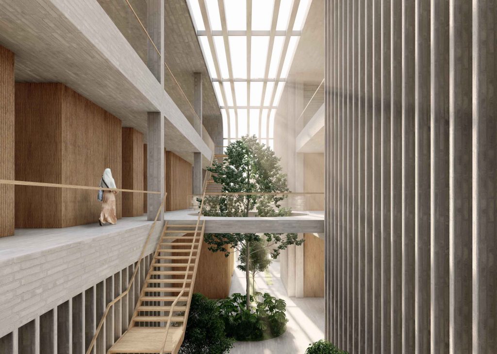 Its most notable feature is its textured brick facade, which is conceived as an urban-scale curtain that pleats away to frame the main entrance of the building. Inspired by the veil-like qualities of traditional Mashrabiyas, the facade’s pleating form has inherent structural stiffness that allows it to exist as an independent system whilst endowing the building with a rich tectonic language.
