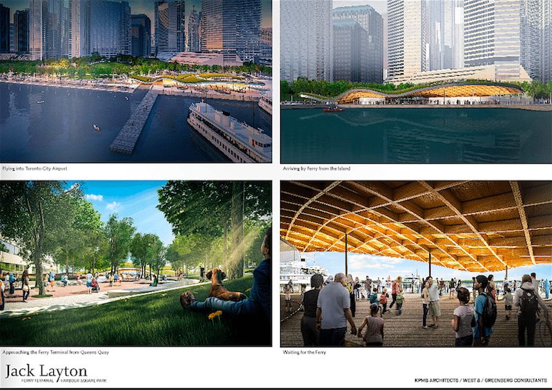 The major departure features of all but one of the entries were the location of two-tier structures directly across from the ferry docks, with two having large canopies as shelter, and two providing rooftop parks with outlooks to the Lake. One of the latter was the winner of the competition, KPMB of Toronto with landscape architecture firm West 8 of Rotterdam and Greenberg Consultants (planning) of Toronto.