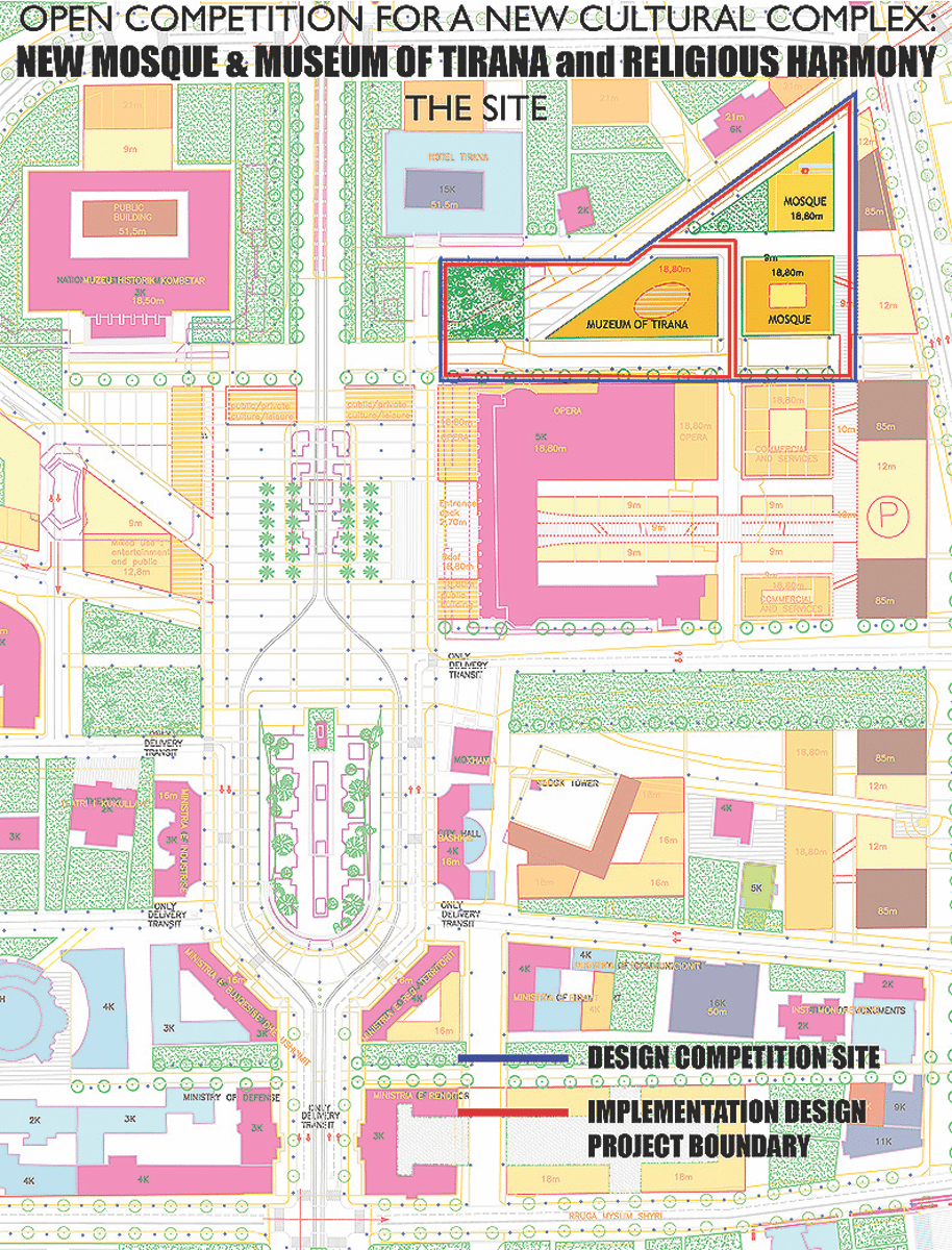 The two-stage, international competition was organized by the City of Tirana and the Albanian Muslim community and advised by Nevat Sayin and Artan Hysa. Over one hundred teams—the vast majority European—submitted qualifications for the first stage. In early March, the short-listing committee selected five teams to receive an honorarium of 45,000 Euros each to develop designs: • Bjarke Ingels Group – Copenhagen, Denmark • seARCH – Amsterdam, Holland • Zaha Hadid Architects – London, UK • Andreas Perea Ortega with NEXO – Madrid, Spain • Architecture Studio – Paris, France The designs were judged by a diverse European panel: • Edi Rama – Mayor of Tirana, Albania • Paul Boehm – architect, Cologne, Germany • Vedran Mimica – Croatian architect; current director of the Berlage Institute • Peter Swinnen – Partner and architect at 51N4E, Brussels • Prof. Enzo Siviero – engineer; Professor at University IUAV, Venice • Artan Shkreli – architect, Tirana, Albania • Shyqyri Rreli – Muslim community representative On 1 May 2011, the panel announced Bjarke Ingels Group (BIG) as the winner.